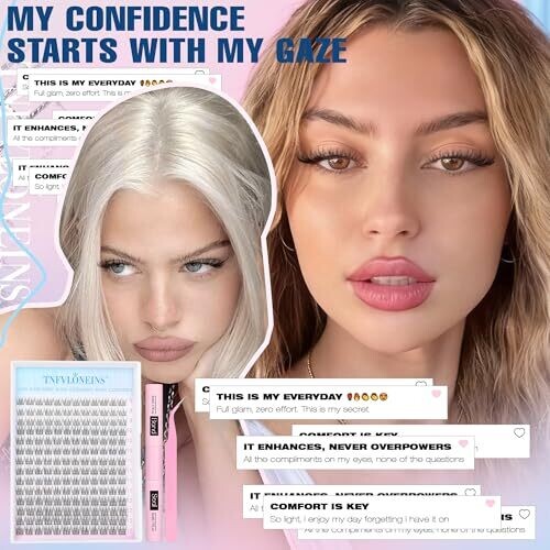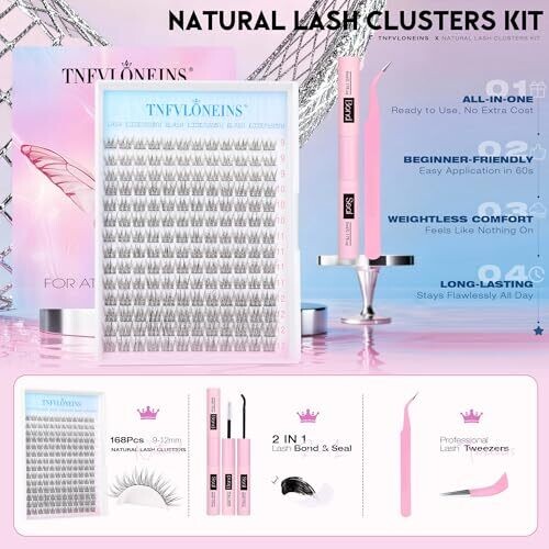 168 pieces of 9–12 mm wispy cluster lashes. 100% handmade with PBT fibers. Claimed to be lightweight and natural in appearance. Suitable for beginners and at-home use. Includes bonding adhesive and sealing solution, plus tweezers as part of the kit. TNFVLONEINS offers a lifetime money-back guarantee.