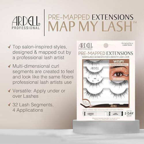 Ardell pre-mapped eyelash extensions kit provides wispy false lashes with reusable segmented strips for long-lasting wear. Includes lash glue and remover for easy application and removal, all in a convenient 4-pack.