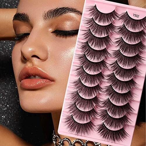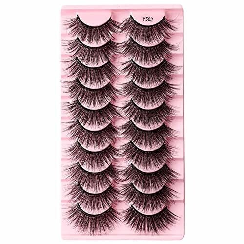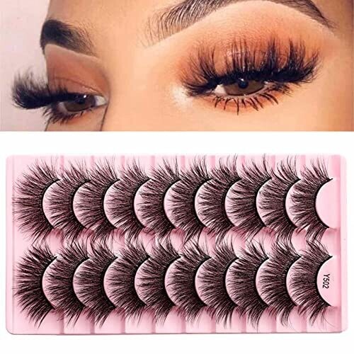 False eyelashes supplied as 10 pairs per package. Design emphasizes long, thick, volume lashes with a cross‑styled or messy look to create a bold eye appearance. Materials are described as soft and durable, with skin‑friendly properties. Reusability is up to 15 uses with proper storage and handling. Intended for users seeking a dramatic lash effect and easy application.