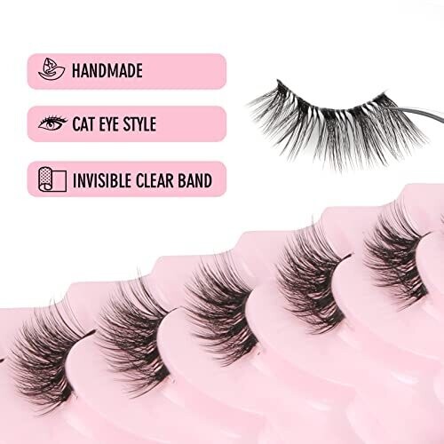 Invisible clear band provides a natural appearance by blending with various eye makeup styles. The product can be worn as half lashes, combined with full-length lashes for higher volume, or cut into clusters for custom effects. The half-length design facilitates easier curling and application for many eye shapes, reducing prep time. The lashes are reusable with proper care. The design aims to create a natural cat-eye look by aligning at the inner corner to blend with existing lashes.