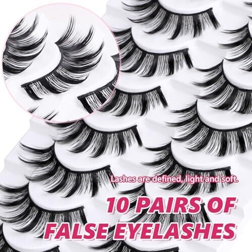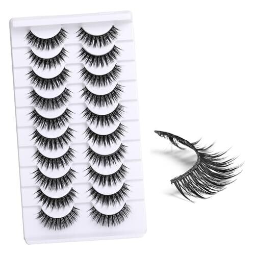 Tormen 10 Pairs Synthetic Fiber Hard Stem False Eyelashes, Wispy Cat Eye Lashes, Durable & Reusable Strip Lashes (Dense)