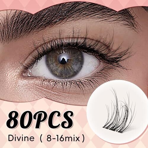 0.05 mm PBT fiber; 0.1 mm superfine lash band; 8–16 mm mixed-length clusters; 80 pieces per set; reusable 10–15 times with proper care; can be washed with 194°F hot water without deformation; withstands regular wear and removal without knotting; designed for DIY lash extensions; compatible with various lash looks including natural, cat-eye, doll-eye, and fox-eye.